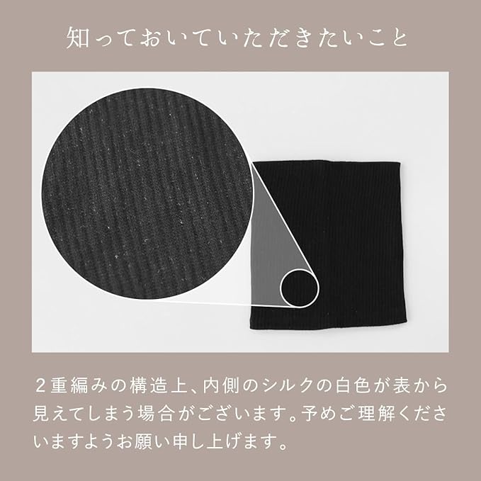 柔らかな質感と優しい光沢感のある綿糸を贅沢に使用しました。空気をよく含むので保湿効果が高く、シルクと組み合わせることにより吸汗放湿するため、蒸れることなく温かさを保ちます。