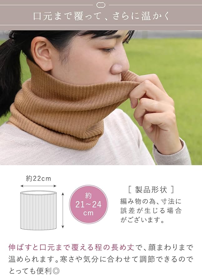 伸ばせば鼻先まで隠れるほどの長めの丈が、寒いときに調節できてとても便利。秋冬の肌寒い時のマストアイテムに。