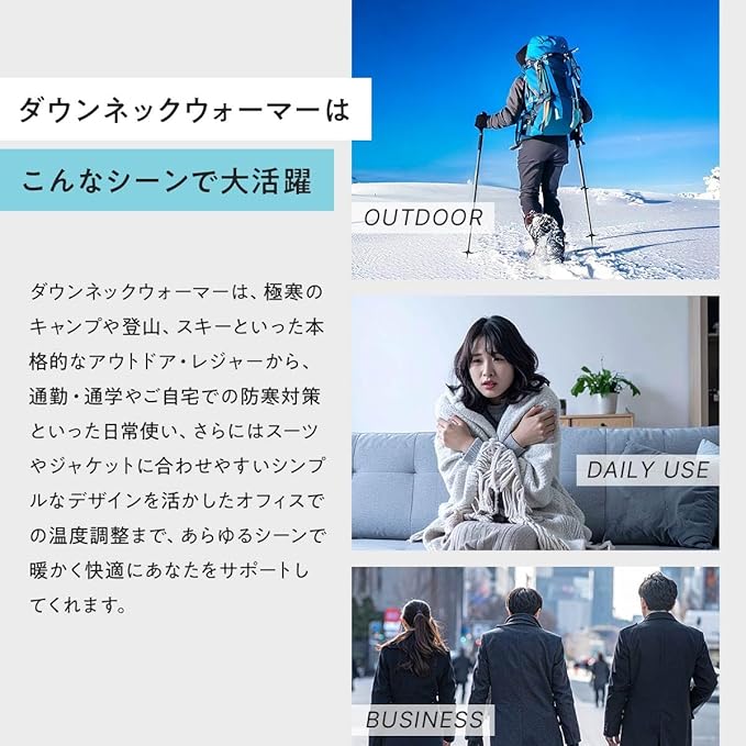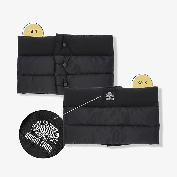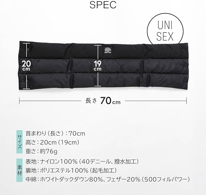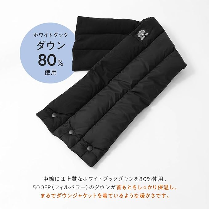 【おすすめポイント】当社(ナイガイ)の靴下と山を愛する社員が企画したダウンマフラーです。良質なホワイトダックダウンを使用して表生地には撥水加工、肌にあたる部分は柔らかな起毛素材を使用しています。着脱に便利な前開き仕様、前ボタンもプラスチック製を採用、これは金属性を使用すると極寒環境で指に引っ付くことを防ぐ工夫です。収納もダウン製なのでとても小さくなります、ジップ袋やコンプレッションバッグなどに入れていただくと嵩張りませんし、生地がナイロンタフタなので取り出した時もシワが気になりません。