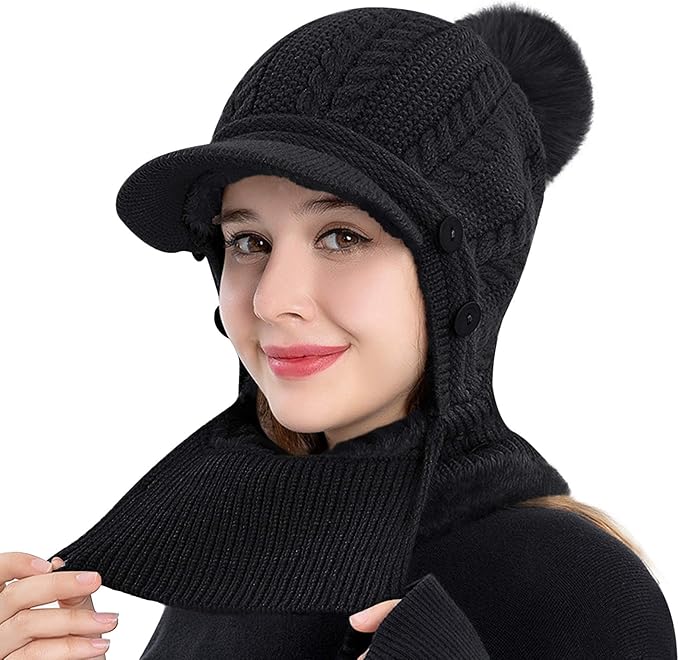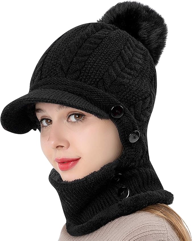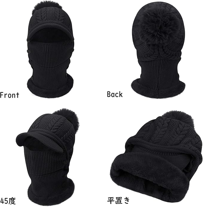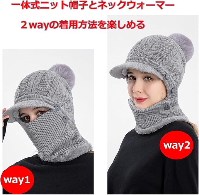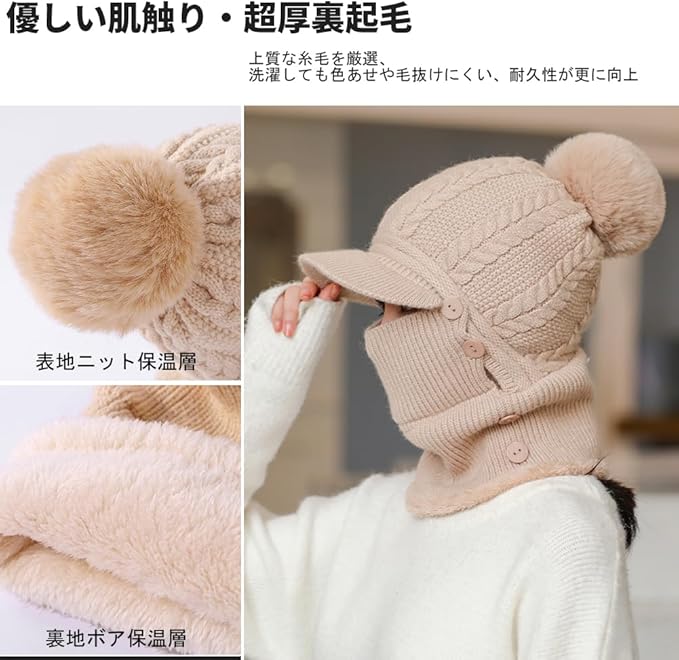 [LeafIn] 2Way&暖かい裏起毛 ニット帽子 レディース ネックウォーマー ネックフェイスカバー ビーニー ニットキャップ ポンポン 厚手 裏起毛 ボア 防寒防風 スノーボード スキー 防寒具 自転車 バイク 釣り 登山 通勤 通学 冬