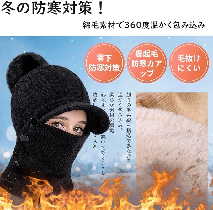 【二重構造で冬を乗り越え】丁寧な毛糸編みで通気と伸縮性が優れて吸湿性がもち、内側はフワフワの裏起毛で、優しい肌触りの同時に頭と首を温かく包み込み、よい被り心地です。二重構造で断熱性に優れ、頭、耳、首元を冷たい風からカードして寒い冬でも暖かく過ごしましょう!