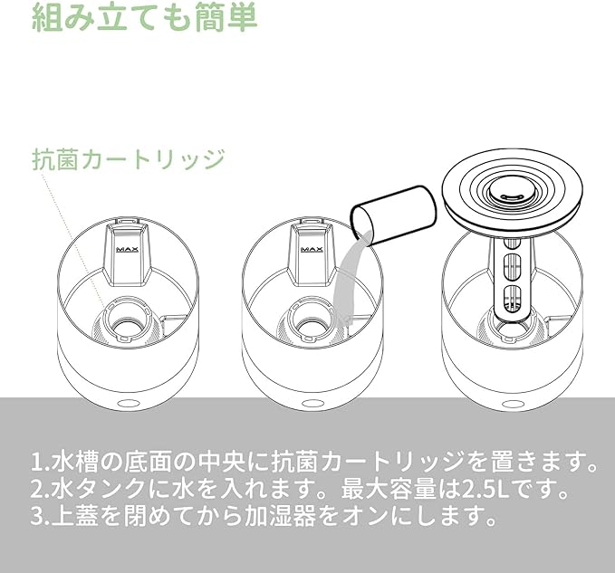 【銀イオン(Ag+)セラミックボール】多くの製品で広く使用されている銀イオン(Ag+)は雑菌の増殖を大幅に防ぐので、雑菌による腐敗臭を抑止します。清潔な水で加湿できます。