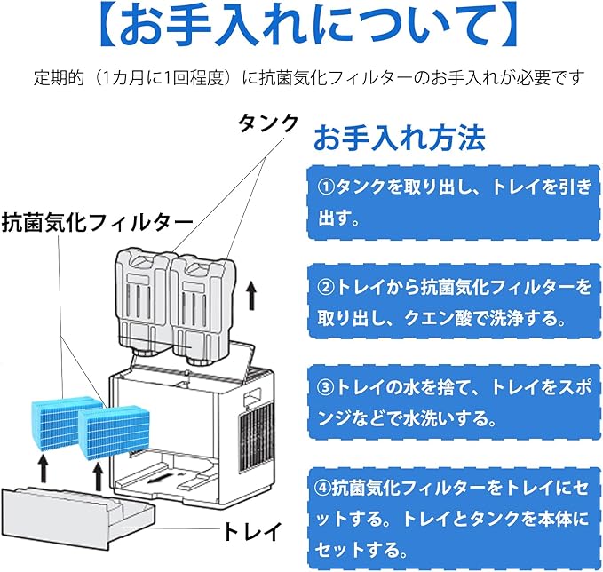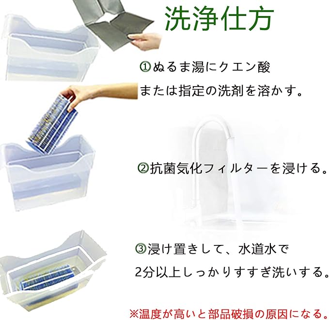 【丸洗い可】2週間~1ヵ月に1回程度できれいな水道水ですすぐ。 ※水アカ、ニオイが取れにくい時、クエン酸や指定の洗剤で洗浄してください。