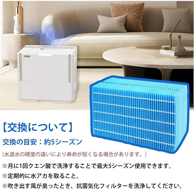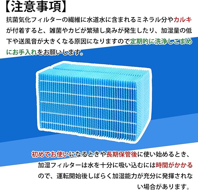 【優れた加湿効能】抗菌気化フィルターを取り換えた後、フィルターの水の吸い上げる力が高く、音が小さく、部屋全体の湿度を一気に上げ、部屋を快適な湿度まで素早く加湿する。また、フィルターは抗菌加工を施し、トレイ内の雑菌・カビの繁殖を抑え、より清潔に加湿できる。
