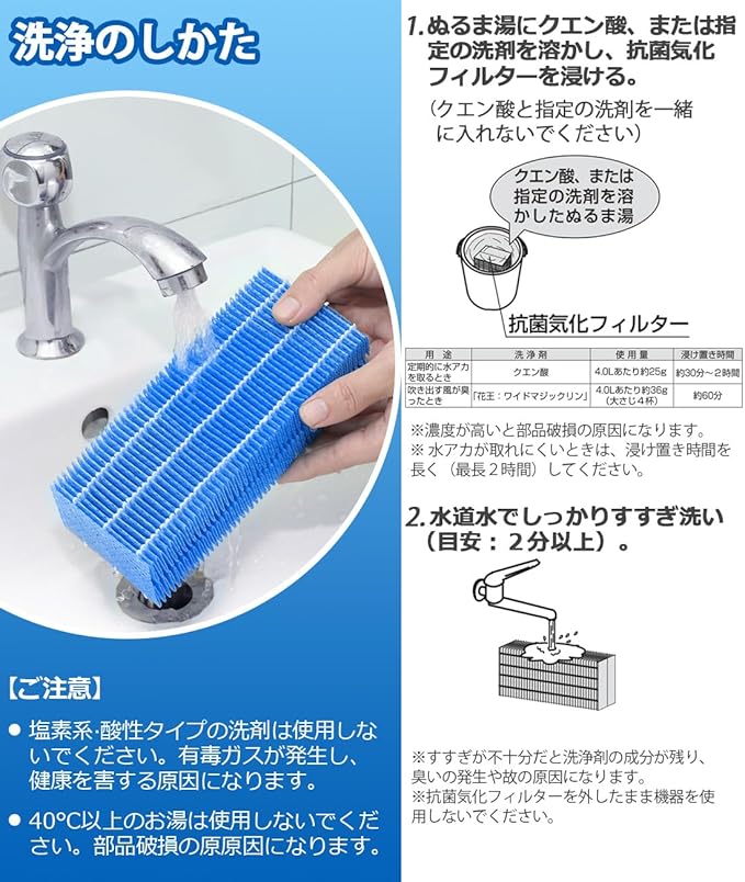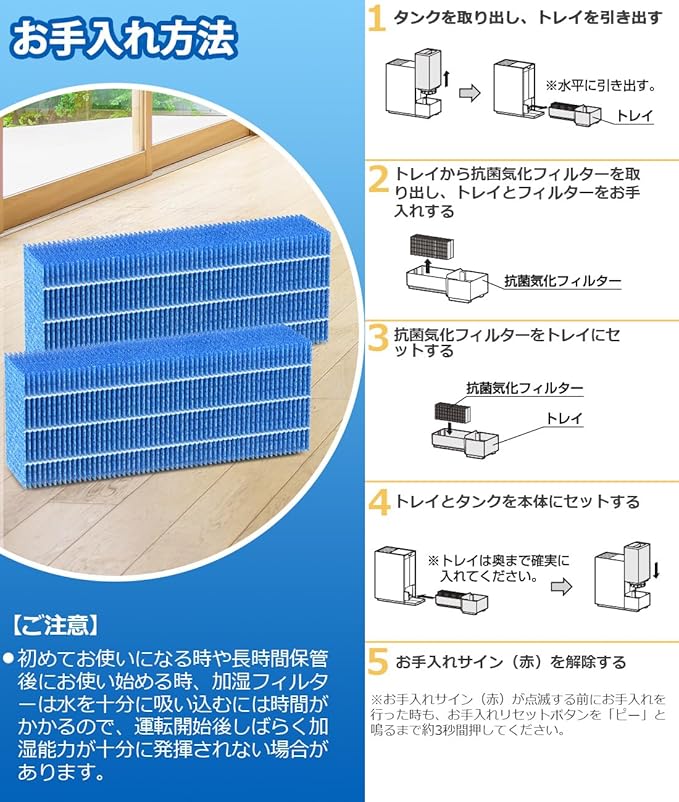 【お手入れの目安】2 週間に 1 回。加湿器フィルターの寿命を確保するため、定期的に洗浄してください。※吹き出す空気がにおったり、加湿量が少なくなってきたときもお手入れしてください。お手入れせずそのまま使用すると、本体内部が高温になる・加湿量が低下する・異臭がするなど故障の原因になる。