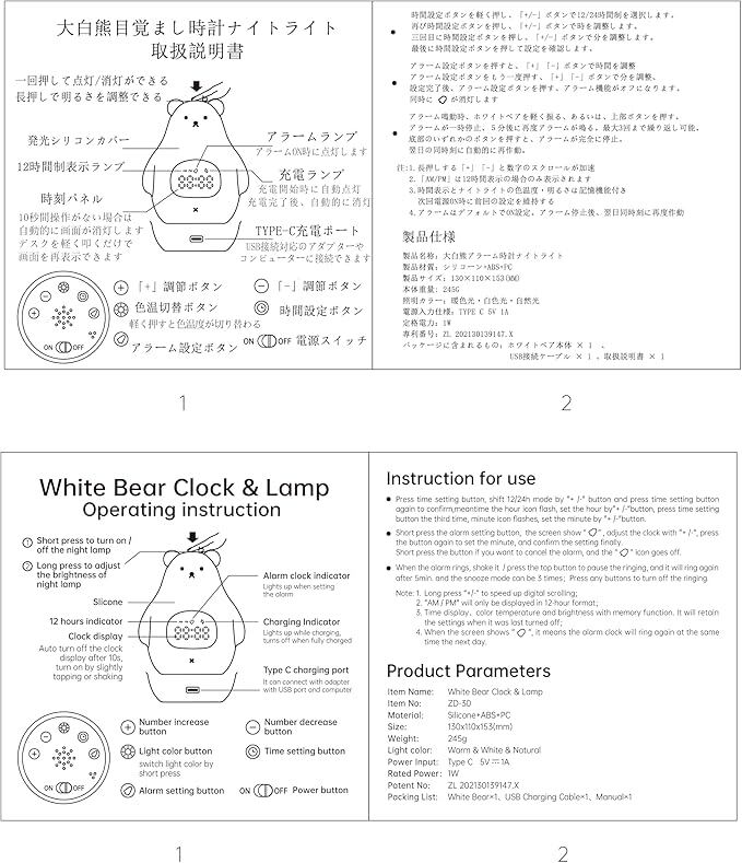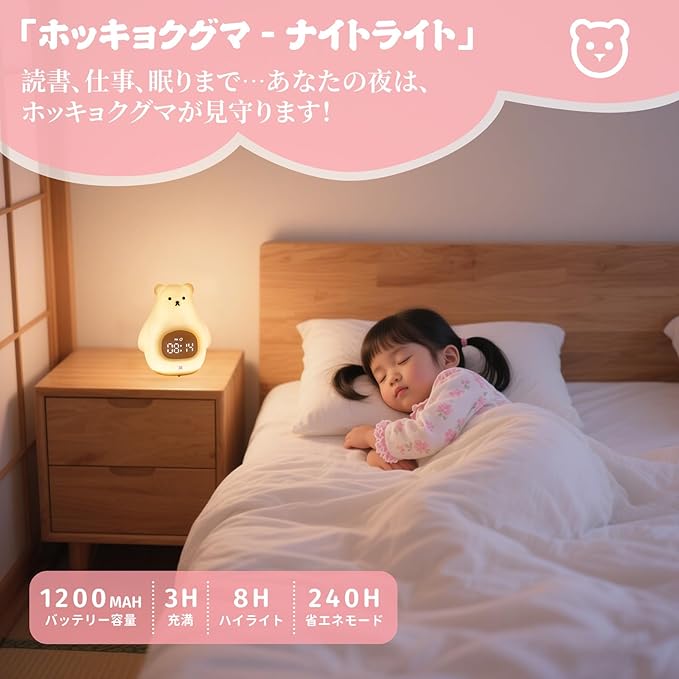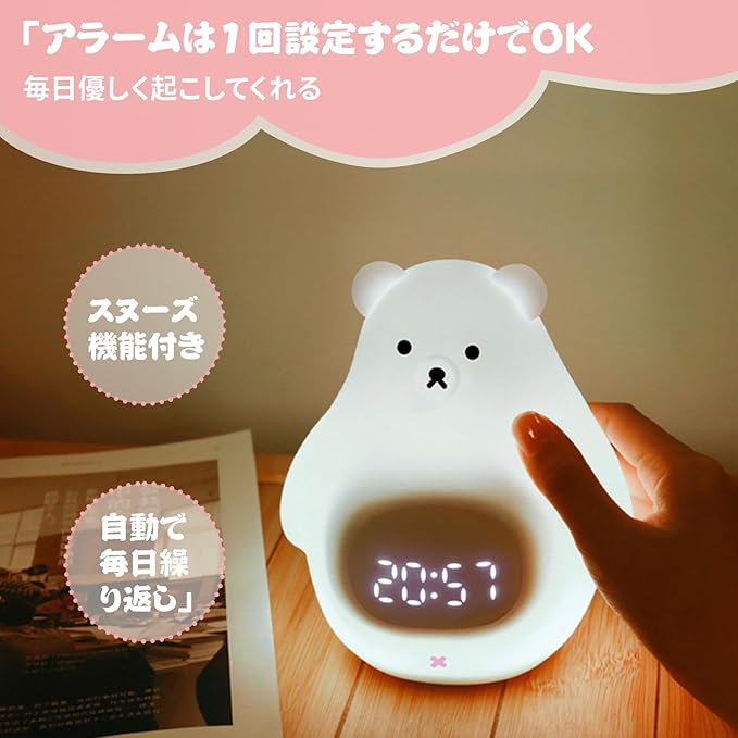 【目覚まし時計を設定】睡眠ライト、デジタル時計、目覚まし時計として使用できます。白いクマをタップして時計モードを起動したり、アラームを設定したりできます。アラームが鳴ったら、白いクマをタップまたは振るとスヌーズモードがオンになり、5分後に再び鳴ります。