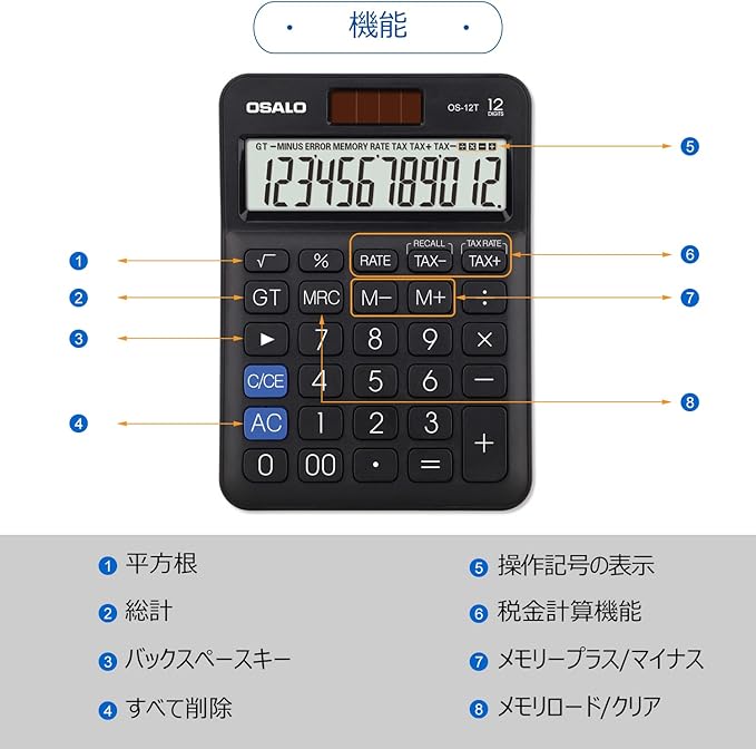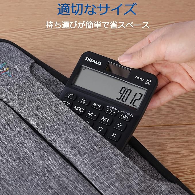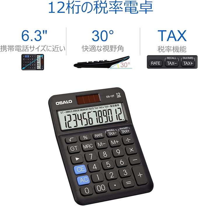 卓上電卓 大型LCDディスプレイ 12桁 数字ビッグボタン 税金会計計算機 電池式 太陽光発電 デスク オフィス 自宅 ビジネス用 (OS-12T 黒)