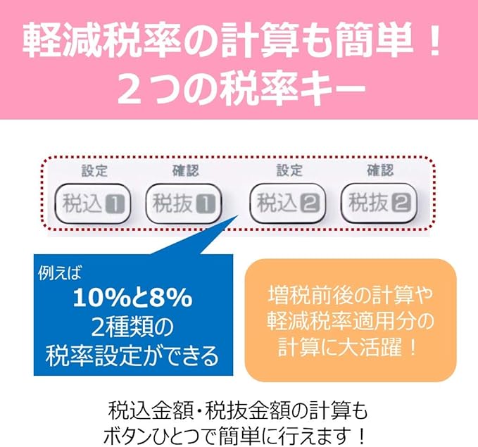 2つの税率登録キー搭載だから、軽減税率の計算にも便利