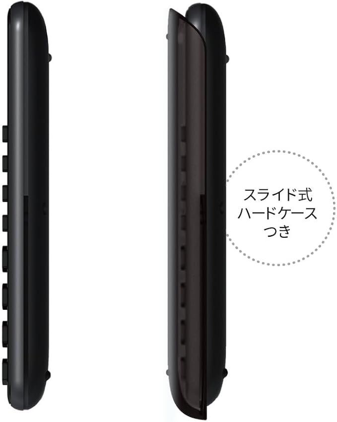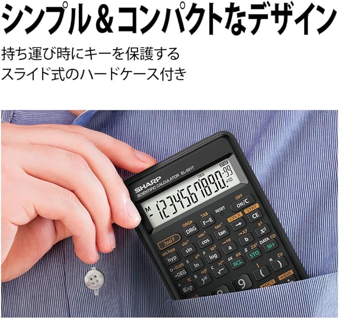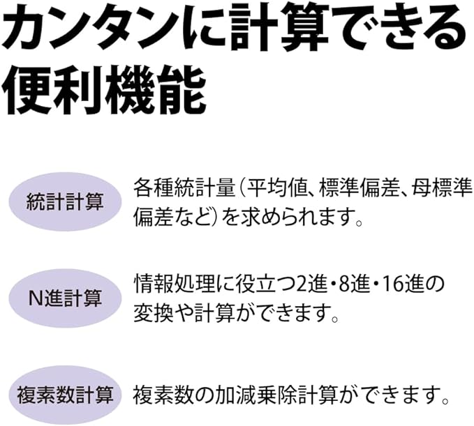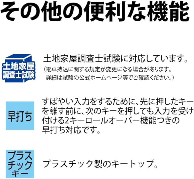 シンプル&コンパクトなデザイン。持ち運び時にキーを保護するスライド式のハードケースつきです。文字天地10mmの大型表示を採用。見やすい3桁位取りつき。カンタンに計算できる便利機能。■統計計算。各種統計量(平均値、標準偏差、母標準偏差など)を求められます。■N進計算。情報処理に役立つ2進・8進・16進の変換や計算ができます。■複素数計算。複素数の加減乗除計算ができます。土地家屋調査士試験に対応。すばやい入力をするために、先に押したキーを離す前に、次のキーを押しても入力を受け付ける2キーロールオーバー機能つきの早打ち対応です。プラスチック製のキートップ。
