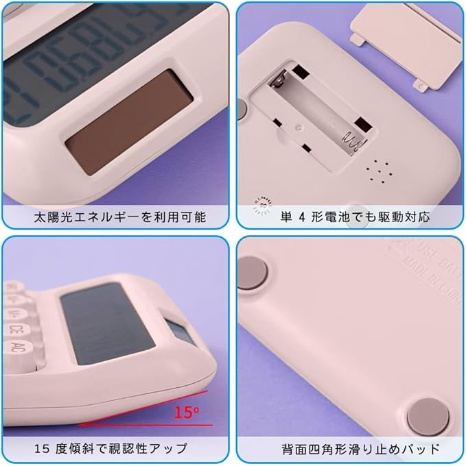 【電卓 12桁 大画面表示】12桁の大型LCDハイコントラスト画面を搭載。15度の傾斜設計が視認性を高め、長い数字の入力や簿記作業もストレスフリー。太陽光・単4形電池(別売)のデュアル電源で切れ目ない計算をサポート。