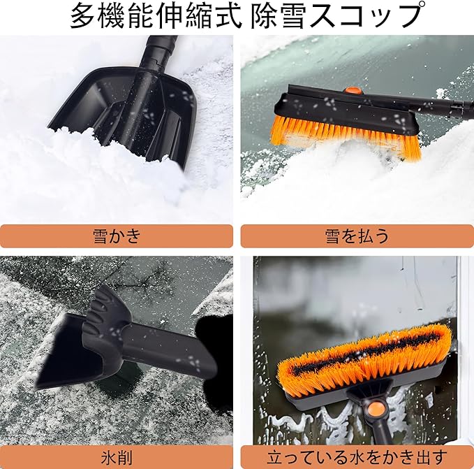 【組み立て簡単・伸縮可・ブラシ調整可】各パーツが取り外し可能で、スノーブラシやスクレーパー、雪かきスコップを状況に応じて単独で使用できます。アルミ製の伸縮レバーは強度が高く、折れにくい設計。100cmまで伸びるスノーブラシで、フロントガラスや屋根の雪を簡単に取り除けます。ボタン一つでブラシの角度を調整可能。