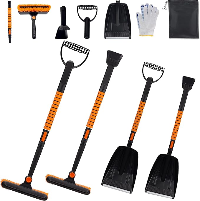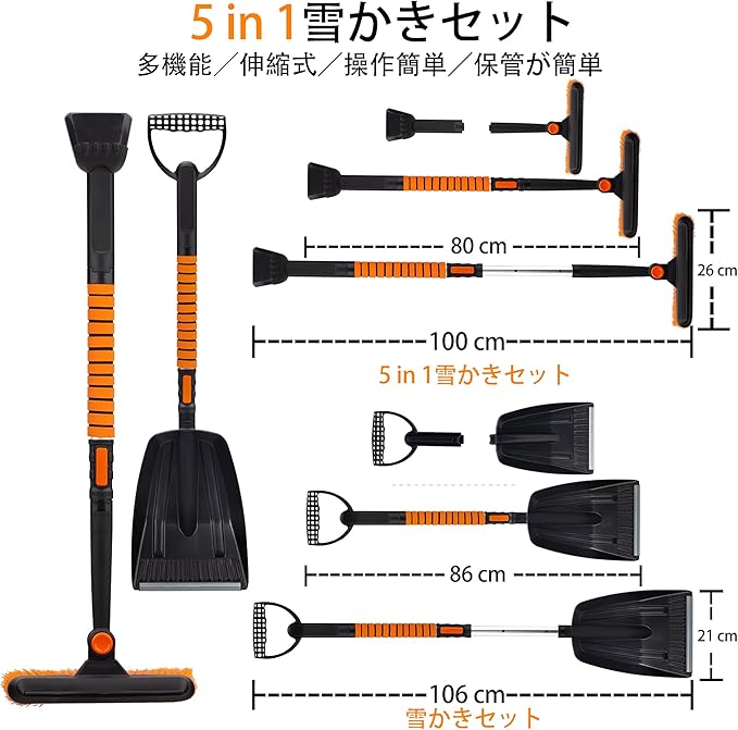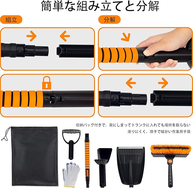 スノーブラシ 雪かきセット 5in1 雪掻きスコップ 雪かきスコップ 車用 車 傷つかない 雪掻き 雪対策 除霜作業 家庭用 軽量 組み立て 収納袋付き 冬作業用手袋付き (オレンジ)
