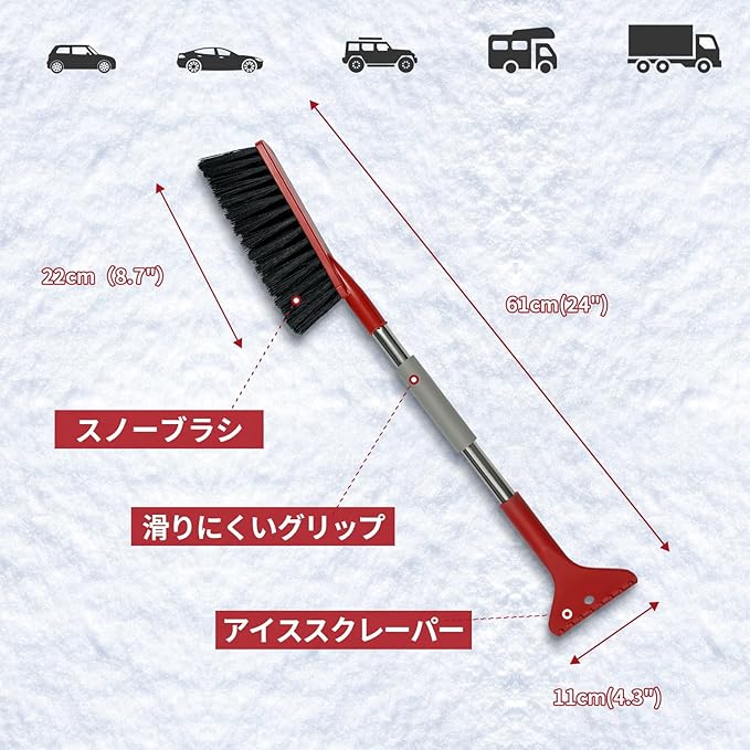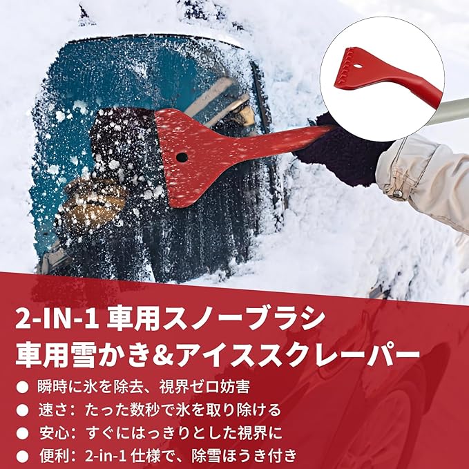 スノーブラシ 2in1 除雪ほうき 雪かき スノースクレーパー 除雪ブラシ 収納袋付き 雪かき 除雪 除霜作業 車用 霜取り 軽量 一瞬でフロント復活 多機能 スノッキー(洗車・ベタ雪用) 自動車 トラック SUVに対応 全長61cm 持ち運びできる(レッド)