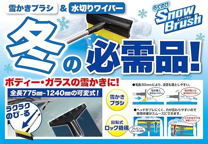 伸縮タイプでミニバンやSUV系の天上や高所でもラクラク雪かき可能! また、回転式ロック機構により、ヘッド部がブレにくく力が伝わりやすいので除雪作業がスムーズにできます。積雪の多い地域で特に活躍する冬季の必須アイテムです。
