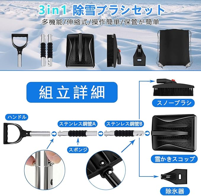 雪かきスコップ 車用 スノーブラシ 3in1 除雪ブラシセット 組み立て式 スノーダンプ スノースクレーパー 霜取りスクレーパー 除氷 除霜 多用途 車載スコップ