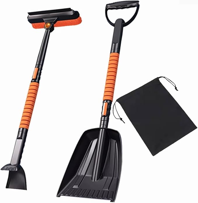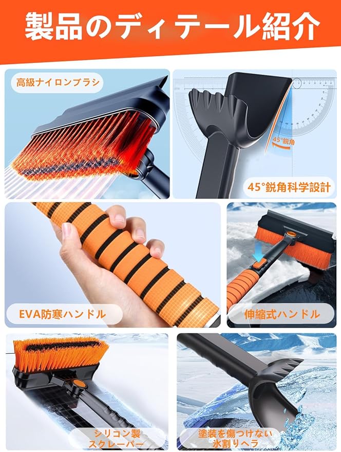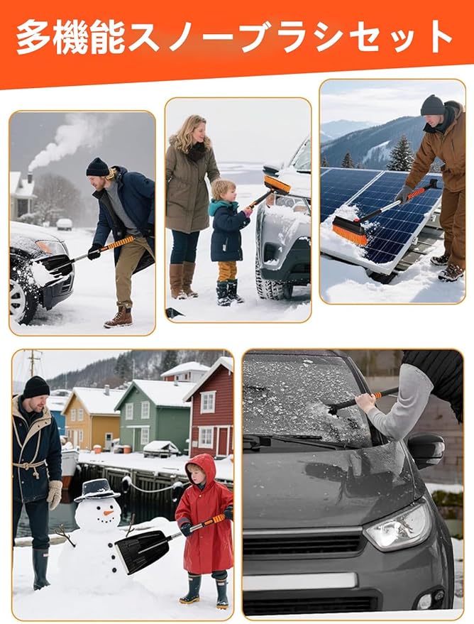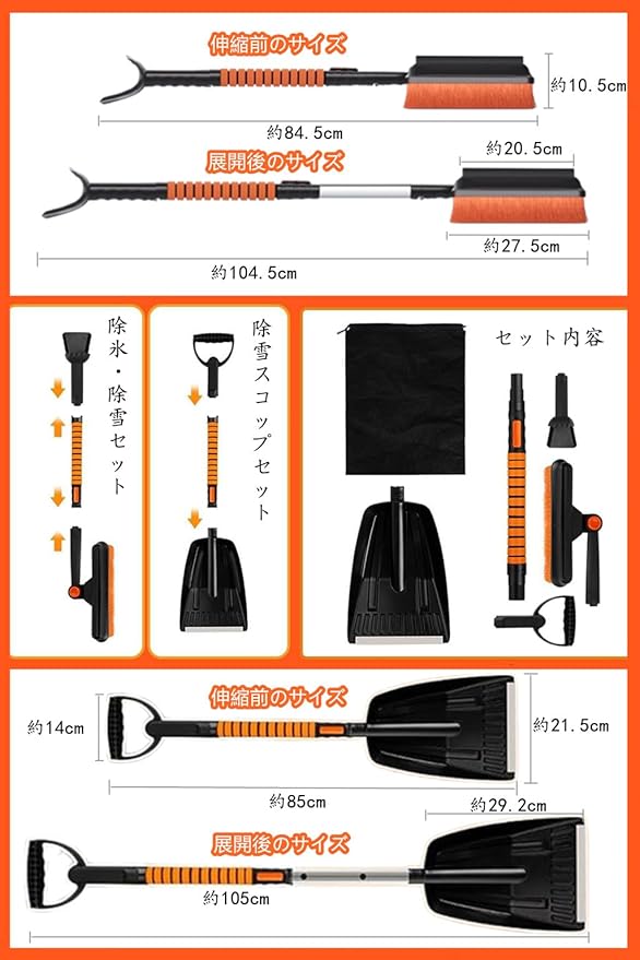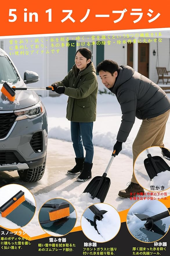 車用雪ブラシ 伸縮式 雪かきスコップ 5-in-1 90 回転スノーブラシ 調節長さ80cm-106cm 傷つかない 組立簡単 携帯便利 砕氷スコップ付き 除雪 除霜作業 除雪用品 凍結対策 収納バッグ付き