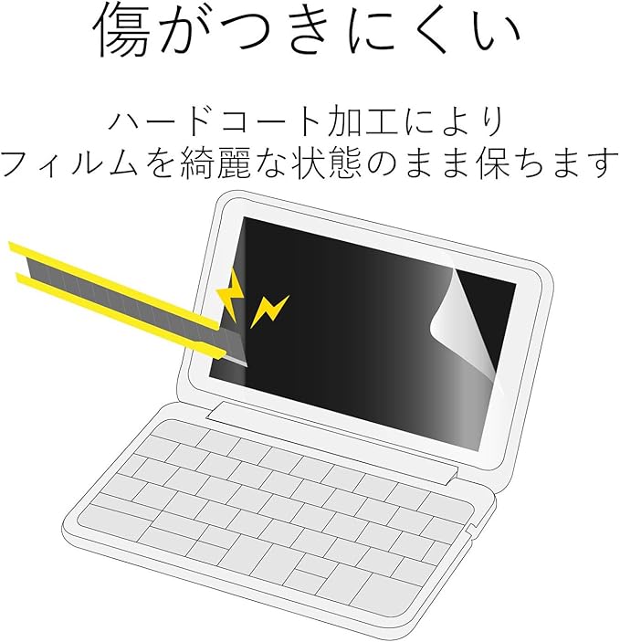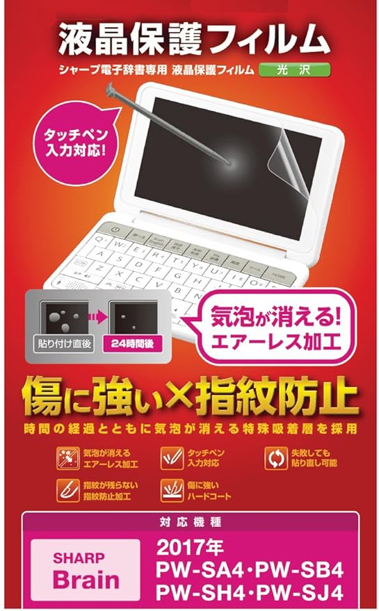 ■電子辞書の液晶画面をキズや汚れから守る液晶保護フィルムです。 ■時間の経過とともに気泡が目立たなくなる特殊吸着層を採用したエアーレスタイプです。 ■小さな気泡ができたときには、指などで押し出すことで気泡を抜くことができます。 ■指紋汚れを付きにくくする指紋防止コーティングを施しています。 ■フィルムを貼ったままでも本体操作ができるタッチスクリーン入力に対応しています。