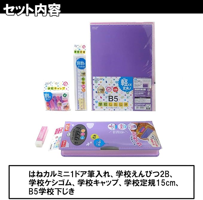 【内容物】はねカルミニ筆入れ、学校鉛筆2B、学校消しゴム、鉛筆キャップ6本、15cm定規、B5下敷き