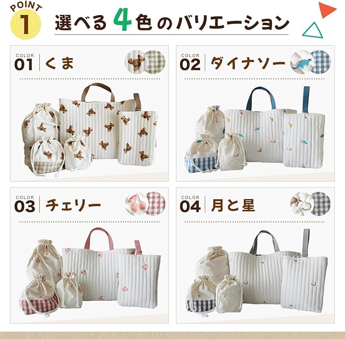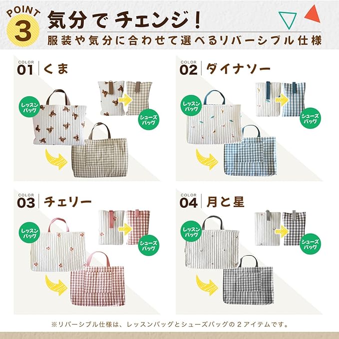 仕様:キルティング生地・リバーシブル(レッスンバッグとシューズケースの2点)、5点全てマチと裏地付き