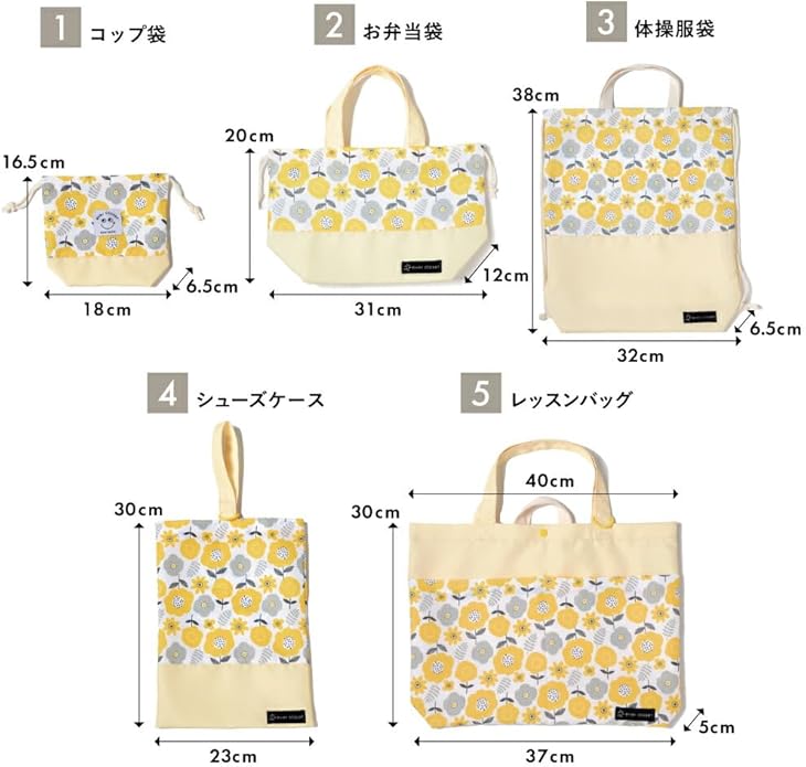 【新学期の準備】全商品お名前タグが付いており通園・通学にもしっかり使えます。レッスンバック・シューズケース・体操服袋・お弁当袋・コップ袋の5つがセットになっており、入学式の準備を一気に進めることができます♪