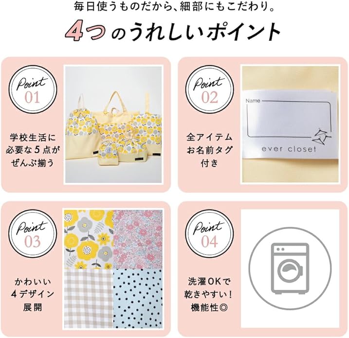 [ever closet] エバークローゼット レッスンバッグ 5点セット 入園入学セット 女の子 入園入学準備 シューズケース 上履き入れ 体操着袋 子供 キッズ