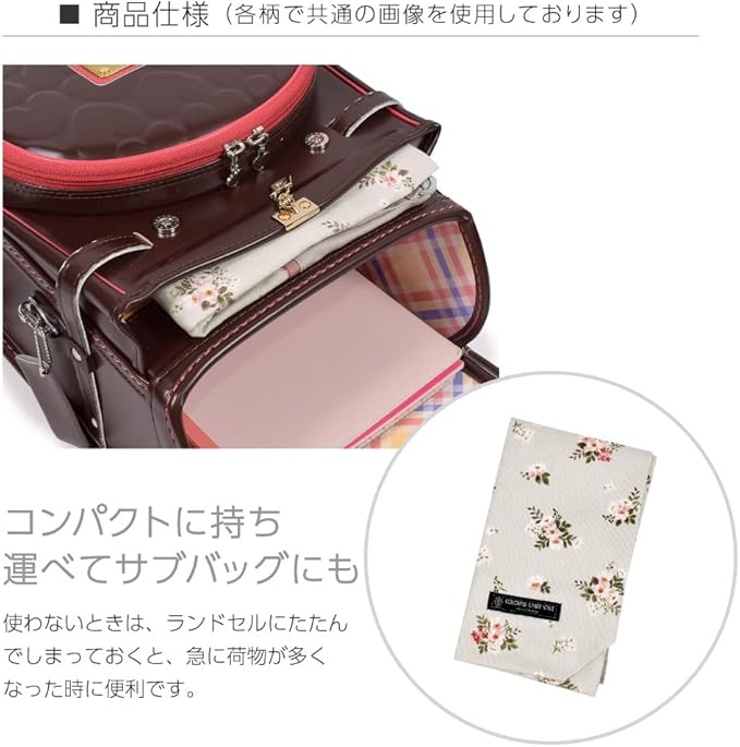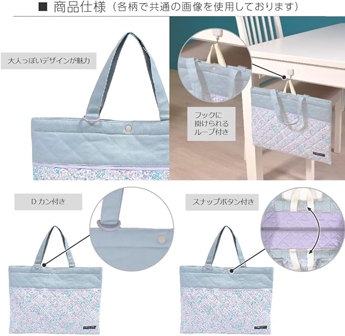 机のフックに掛けても床につかない便利なループ付き。小学校・幼稚園・保育園の一般的な指定サイズ30 40cmで、大判絵本やスケッチブックも入ります。持ち手はお子さまの手にも持ちやすいテープ仕様。付属のDカンにはキーホルダーやパスケースを付けることができます。