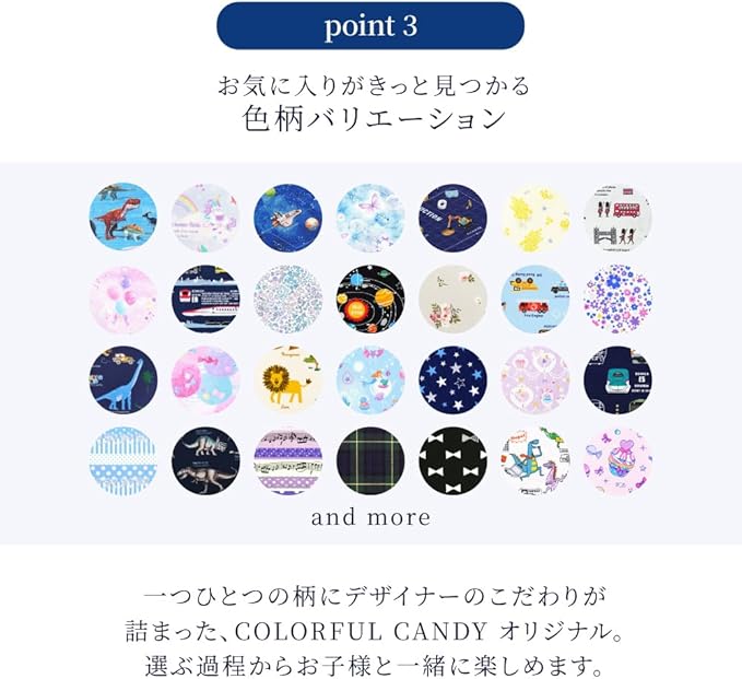 キッズ&ベビー用品のCOLORFUL CANDY STYLE (カラフル キャンディ スタイル) は入園・入学グッズからキッズ向け各種ライフスタイルアイテムまで豊富な色柄をラインアップ。 大切なお子様が「毎日使うもの」を選択するなら、マーケットでひとくくりに「幼稚園児用」、「小学校低学年用」と分類されたものや大量生産のキャラクターだけを選択肢にすることでよいのだろうか、という疑問から当限定商品は始まりました。 お子様一人ひとりの興味や個性、ご家庭の教育方針やご両親の好み・センスは千差万別です。 また、子供の成長の度合いがそれぞれに異なることはママやパパならどなたでも実感されていることでしょう。 毎日こどもが手にするものだからこそ、一人ひとりの個性や発達段階に沿ったものを選ぶべき、と考えます。