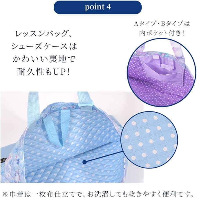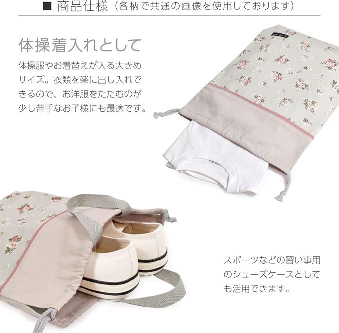 サイズ(単位:cm):レッスンバッグタテ:約30/ヨコ:約40/持ち手高さ:約16/ループ高さ:約4.5 シューズケースタテ:約29/ヨコ:約23/底幅:約17/マチ:約6/持ち手高さ:約16