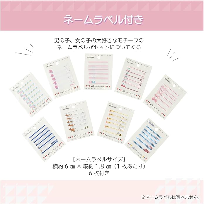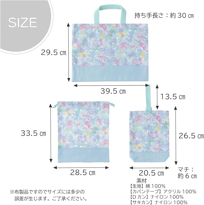セット内容(サイズ):レッスンバッグ(横約39.5cm 縦約29.5cm 持ち手長さ約30cm)・上履き入れ(横約20.5cm 縦約26.5cm マチ約6cm 持ち手高さ約13.5cm Dカン幅約25mm)・体操着袋(横28.5cm 縦約33.5cm)・お名前シール 5枚/アイロン接着(1枚あたり 横約6cm 縦約1.9cm)