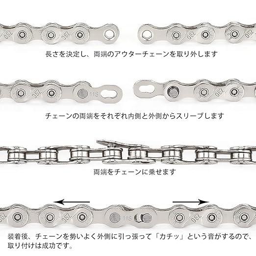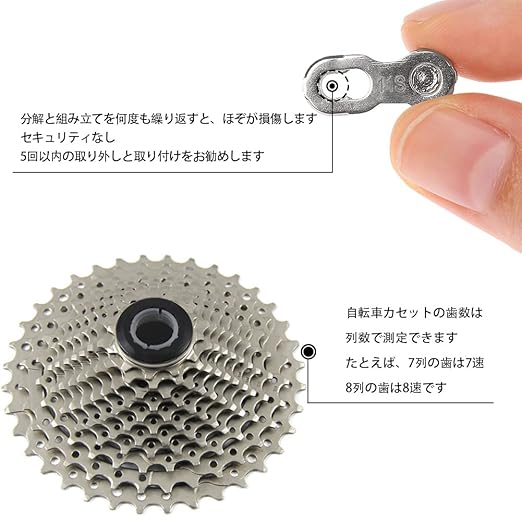 使用回数:不適切なピンの取り付けによって引き起こされるリンク切れやチェーンの破損は避けてください。 使用回数に限りがありますので、5回以内の取り外しと取り付けをお勧めします。