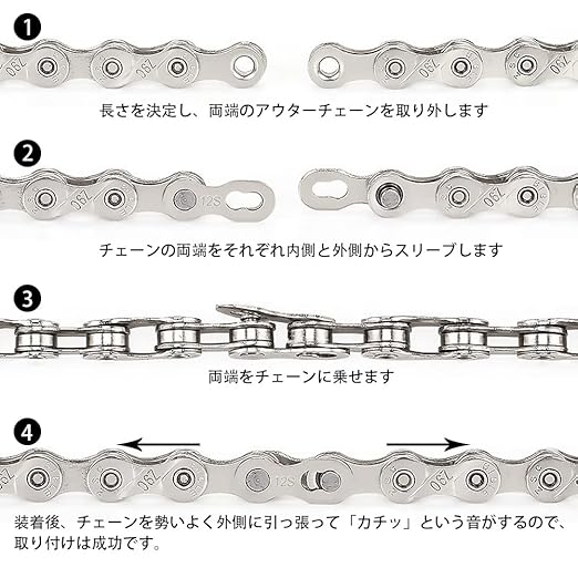 使用回数:不適切なピンの取り付けによって引き起こされるリンク切れやチェーンの破損は避けてください。 使用回数に限りがありますので、5回以内の取り外しと取り付けをお勧めします。