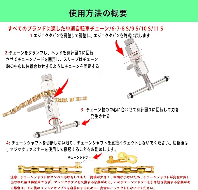 2.チェーンカッター ;自転車、高品質高炭素鋼強度高耐食性耐食性、適用:単速、6/7/8/9/10/11速、各限定商品自転車チェーン。動く取っ手のデザインは取り外しの力が把握しやすく、注意:自転車チェーンにしか使用できず、他の交通機関チェーンは使用できない