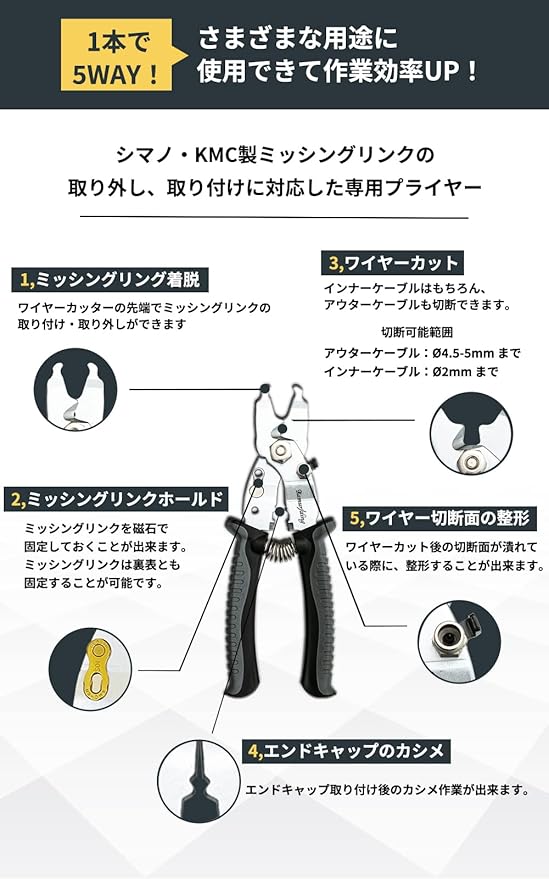 ♂️【1本で5WAY!さまざまな用途に使用できる!】これ一つで5つの用途に使用できます。①ミッシングリンク着脱②ミッシングリンクホールド③ワイヤーカット≪アウターケーブル 4.5-5mm まで,インナーケーブル 2mm まで≫④エンドキャップのカシメ⑤ワイヤー切断面の整形