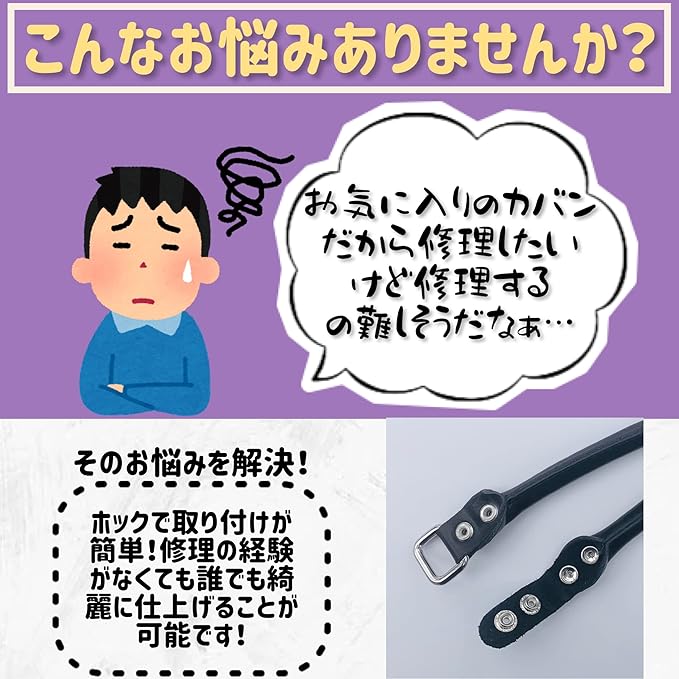 取り付け部分がホックになっており、パチン!と止めるだけの簡単取り付けタイプです。誰でも簡単に取り付けが出来るため、かばん修理の経験が無くても綺麗に仕上げることが出来ます。