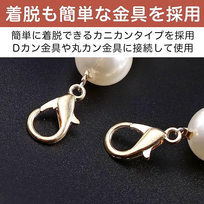 カニカンタイプで着脱も簡単:手早く簡単に着脱できるカニカンタイプの金具を採用しています。全長約30cmのバッグストラップで、お手持ちのバッグやポーチのDカン金具や丸カン金具に接続して使用することができます。