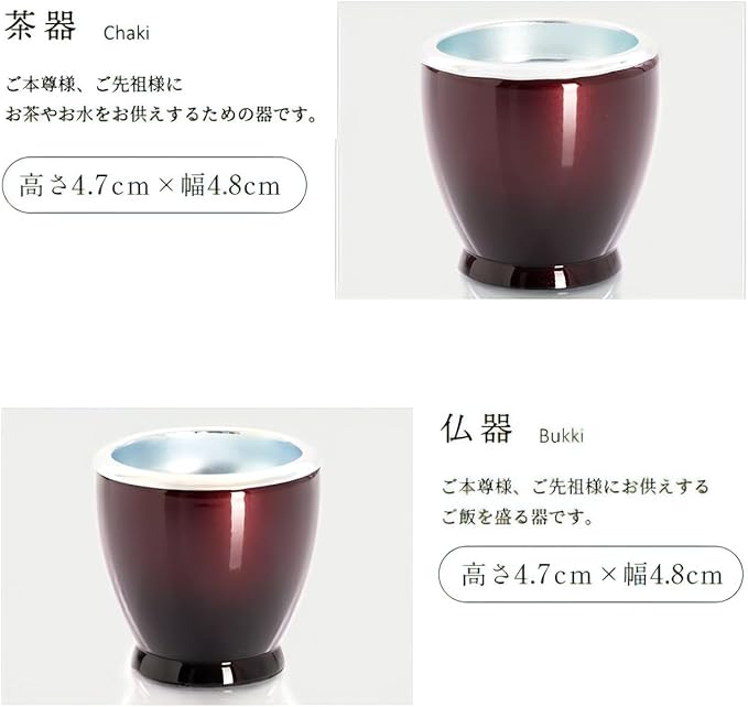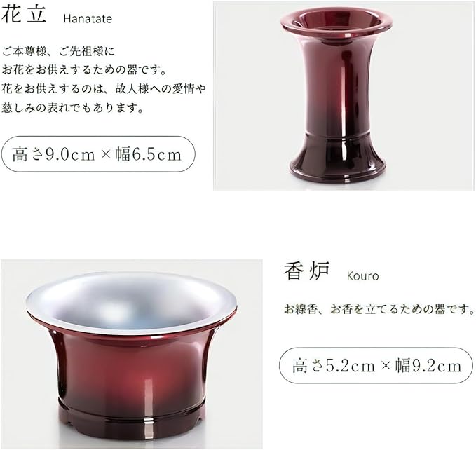 【商品サイズ】茶器 高さ4.7cm 幅4.8cm / 仏器 高さ4.7cm 幅4.8cm / 花立 高さ9.0cm 幅6.5cm / 香炉 高さ5.2cm 幅9.2cm / 灯立 高さ7.3cm 幅5.0cm(芯を含まない高さ6.3cm) / 線香立て 高さ7.7cm 幅5.0cm / おりん 高さ3.6cm 幅6.8cm / りん台 高さ3.0cm 幅8.6cm ※おりん+りん台 高さ 5.9cm / りん棒 長さ11.6cm 幅 1.1cm