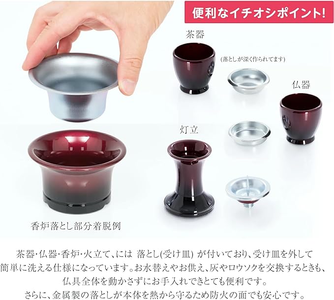 美しいグラデーションと上品な艶が特徴的で専用のリンが付いた仏具セットです。どのようなお仏壇にも合う美しいフォルムでお仏壇を華やかに演出いたします。 お手入れがしやすい「落とし」も付いており、お手入れがしやすく機能性も兼ね備えた仏具となっております。