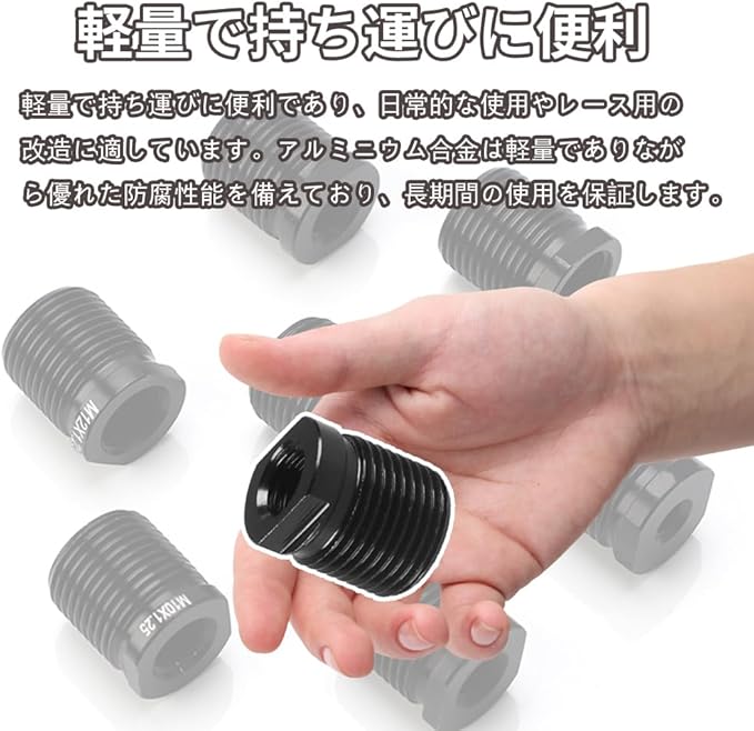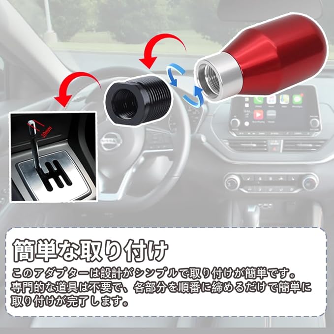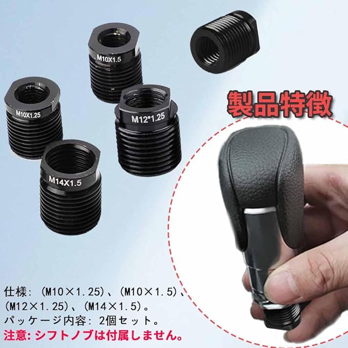 1.多種サイズ:5種類の内部ねじサイズを提供します:(M10x1.25)/(M10x1.5)/(M12X1.25)/(M14.X1.5)。外部ねじのサイズはM18 1.5で、多くの車両のシフトノブに適合し、さまざまなニーズに応じます。*注意:シフトノブは付属しません。