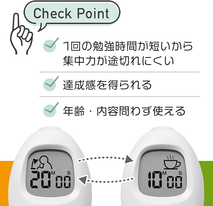 勉強と休憩の時間をそれぞれ設定できるインターバルタイマー機能を搭載。長時間勉強するよりも短時間で勉強と休憩を繰り返した方が集中を維持することができます。