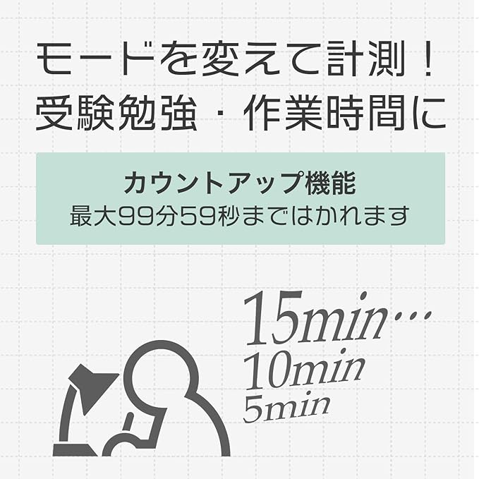 勉強時間を測定できるカウントアップ機能を搭載。受験や資格などのテスト本番を意識たトレーニングに最適です。