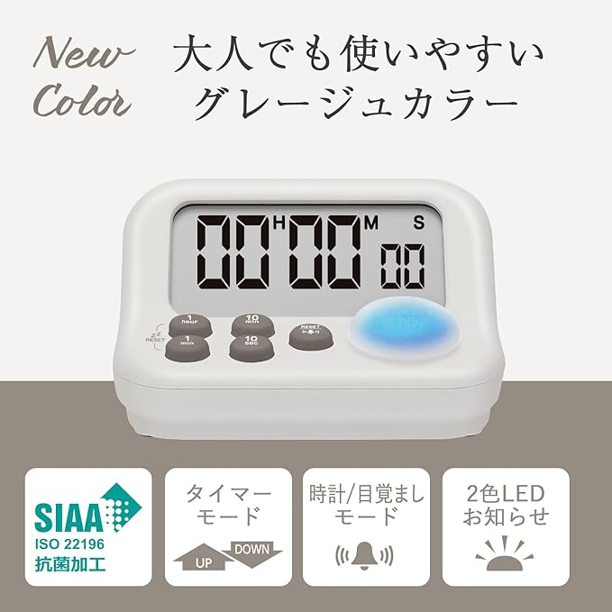 【清潔に使える抗菌仕様】SIAA(抗菌製品技術協議会)が定めた安全性基準を満たした抗菌タイマーです。小さなお子さまも安心してお使い頂けます。抗菌とは、菌を長時間増やさないことで、製品の表面上の細菌の増殖を抑制します。