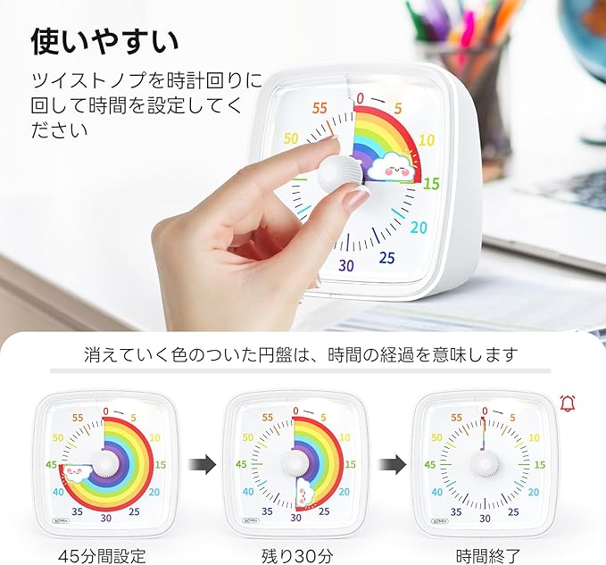 簡単設定 設定: ノブを時計回りにひねるだけで、必要なカウントダウンを簡単に設定できます。カラーディスクが「0」になったら終了です。その後、ベルが鳴り、時間の終了を知らせます。