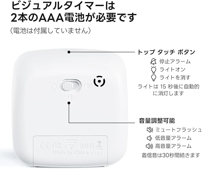 ストップアラーム: ビジュアルタイマーには3つのリングモードがあります:消音、低音、大音量。あなたは必要なモードを選択することができます。他のタイマーに比べ、このタイマーは呼び出し音のタッチ一時停止機能があります。ベルが鳴ると、30秒間鳴り続け、自動的にオフになります。アラーム音が短すぎたり長すぎたりしないように、上のボタンを押して一時停止することができます。