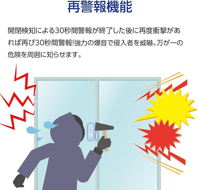【120~130dB爆音警報】作動すると30秒間の大音量アラーム!手動停止以外では止められず、侵入者を強力に威嚇。