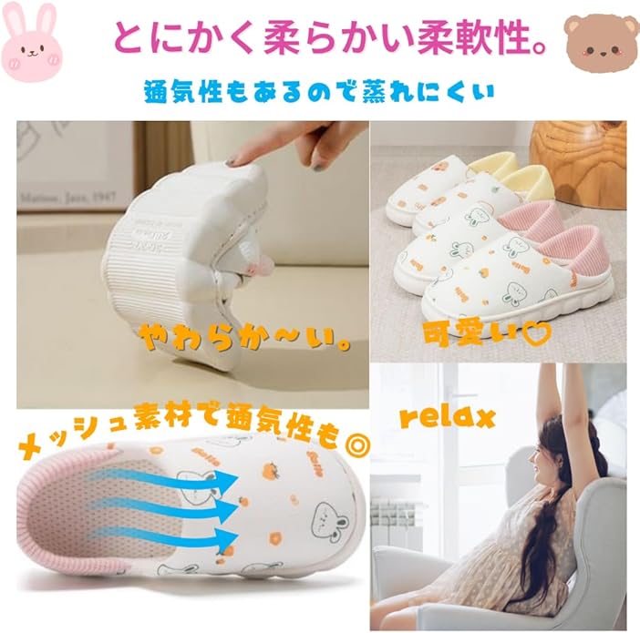 ソールはゴム素材で滑り止め加工してありますので、フローリングでも安心してご使用いただけます。アッパー部分は厚みがございますので床からの冷えも防止してくれます。足のサイズが小さな方でもしっかりと包み込んでくれますので快適にご使用いただけます。