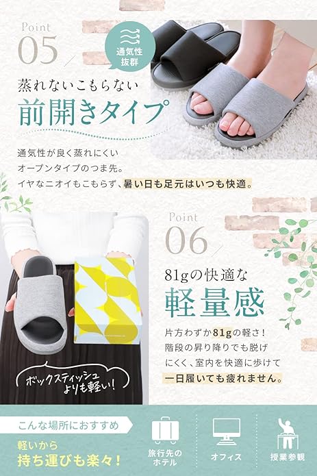 【超軽量で足に優しい設計】 驚くほど軽いルームシューズで、長時間履いても足への負担を感じません。軽量素材を使用し、片足わずか81gで、歩くたびにふわっとした軽やかな履き心地を提供します。スリッパ メンズ レディース どちらでも使いやすく、持ち運びにも便利。オフィスや旅行先でも快適に履けるルームシューズとして最適です。軽量でありながら耐久性にも優れ、毎日快適に使用できます。