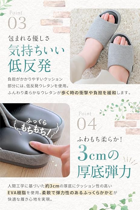 【厚底クッションで衝撃吸収】 約3.5cmの厚底デザインが足への衝撃を吸収し、快適な歩行をサポート。低反発素材のインソールが足裏にフィットし、リラックスできる履き心地を実現。室内作業や立ち仕事の負担を軽減します。ルームシューズ おしゃれ でありながら機能性にも優れたスリッパです。足元の疲れを和らげるため、一日中履いていても快適。高級感のある見た目も魅力で、プレゼントとしても人気があります。