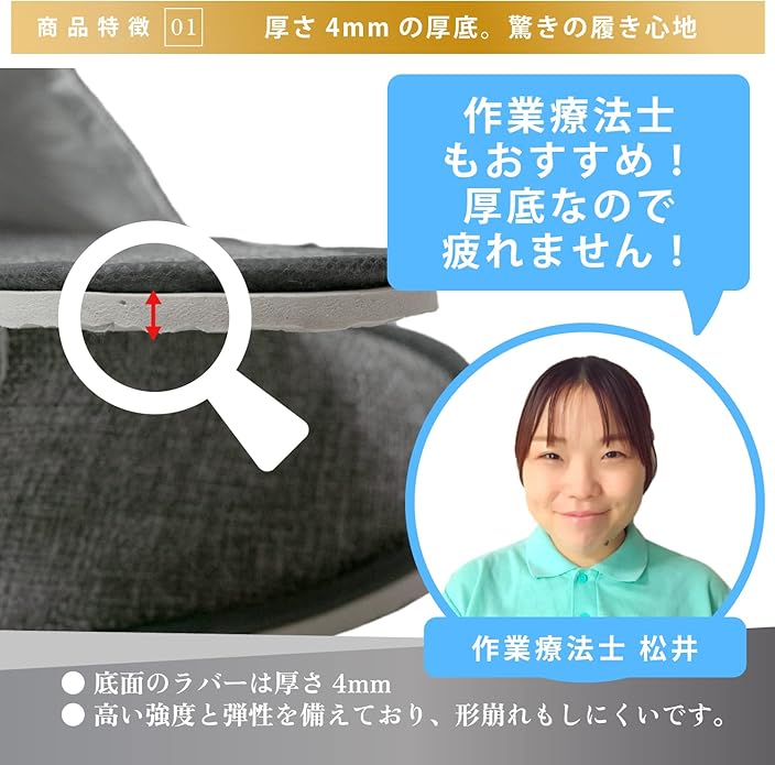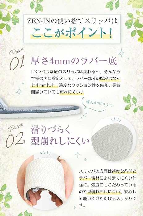 【お客様の声を形に「大きめサイズ」「厚底」】「底の薄いスリッパは歩き辛い、疲れる」というお客様の声を反映し、ラバー部分の厚みは4mm以上!使い捨てのペラペラ感をなくし、歩行時の衝撃を吸収できる厚みにしました。底面は滑り止め仕様で歩きやすく、安定感・快適感のある「使い捨てるにはもったいない」使い捨てスリッパを実現しております。