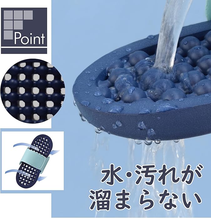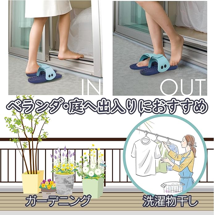 【手軽に履けて整頓不要だから様々な場所で】出入りが頻繁な玄関、勝手口、ベランダ、縁側用におすすめ。また水や汚れが溜まりにくい仕様のため衛生的に使え、ユニットバスや屋根のないベランダにも◎※外履き用ではございません、長時間の歩行には適しません。