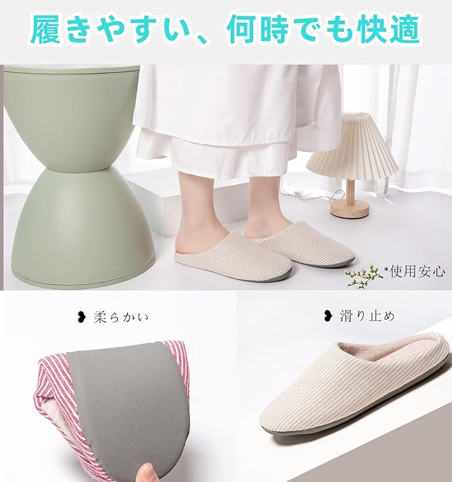 【通気防臭&デザイン】実用性とデザインに優れた柔らかいスリッパです。手触りが快適な天然棉素材を採用され、通気性が良く、吸収性や発散性に優れており、防臭効果があります。見た目もおしゃれなストライプ柄で、和風なお家、洋風なお家両方の玄関どちらに置いてあっても違和感はありません。